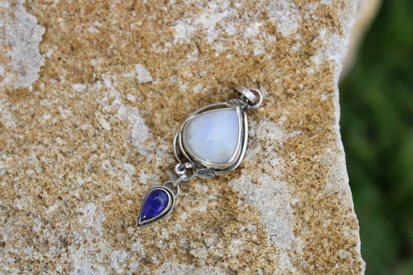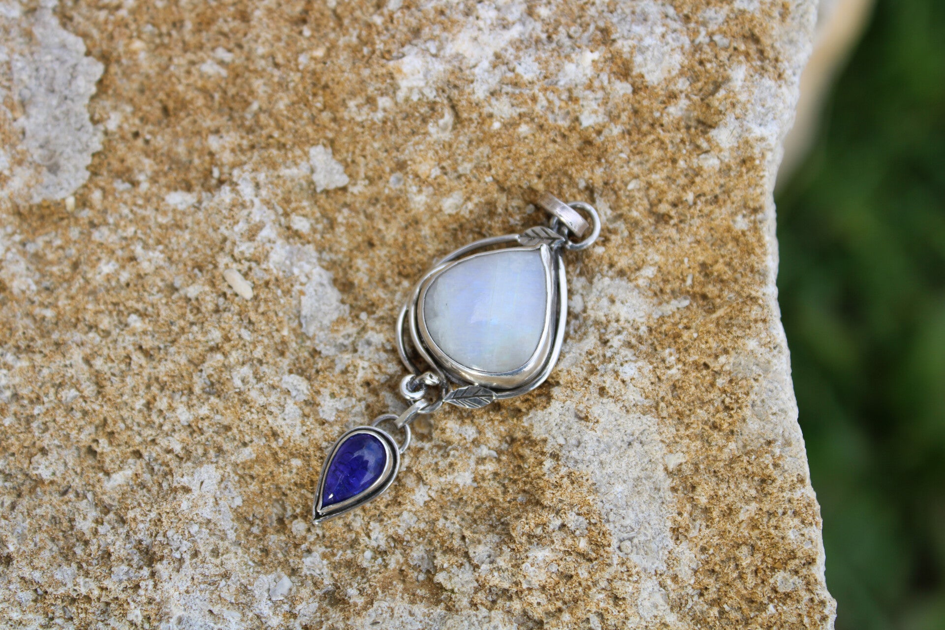 Ce bijou est composé d'une goutte de tanzanite d'un bleu profond, ainsi que d'une labradorite blanche, aussi nommée pierre de lune arc en ciel. Le tout est fabriqué en argent massif dans un style elfique.